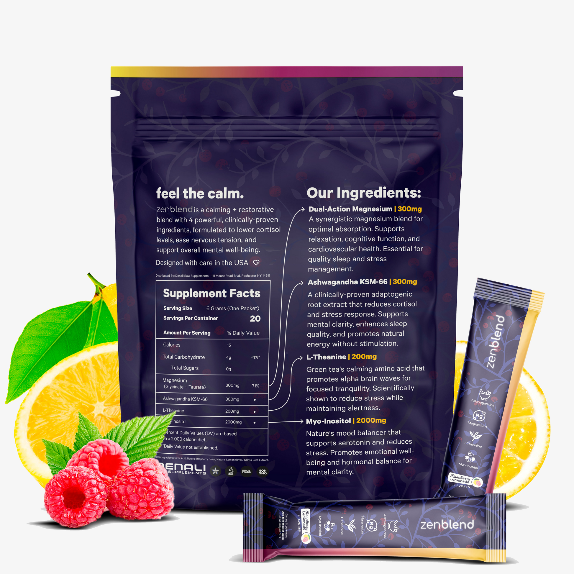 Find your calm with Denali ZenBlend, a premium natural supplement expertly formulated to help you manage stress, reduce cortisol levels, and support adrenal balance. Whether you're facing a demanding schedule, mental fatigue, or just seeking a more peaceful state of mind, ZenBlend is your daily dose of serenity.
